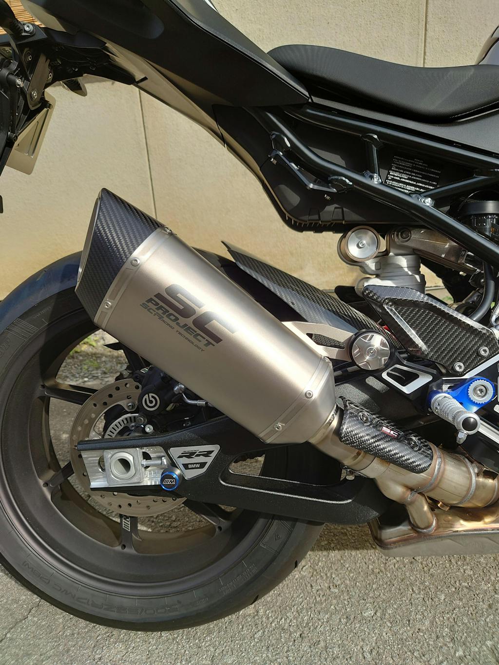 今回S1000RRのマフラーを交換するに辺り、純正オプションのスロベニア製のA社を検討したのですが、標準より長いサイレンサーデザインが気に入らず他ブランドを探していました。合法マフラーが絶対条件でしたので、MotoGPワークスチーム等が採用している実績にてSC-PROJECTを選択しました。オリジナルデザインを崩したくないので、サイレンサーはSC1-Rのチタンを選択。実物を手にしたところ、マテリアルの質感、細かいディテール、溶接痕等Made in Japanと遜色無い(それ以上!?)品質に、良い意味で期待を裏切られました。