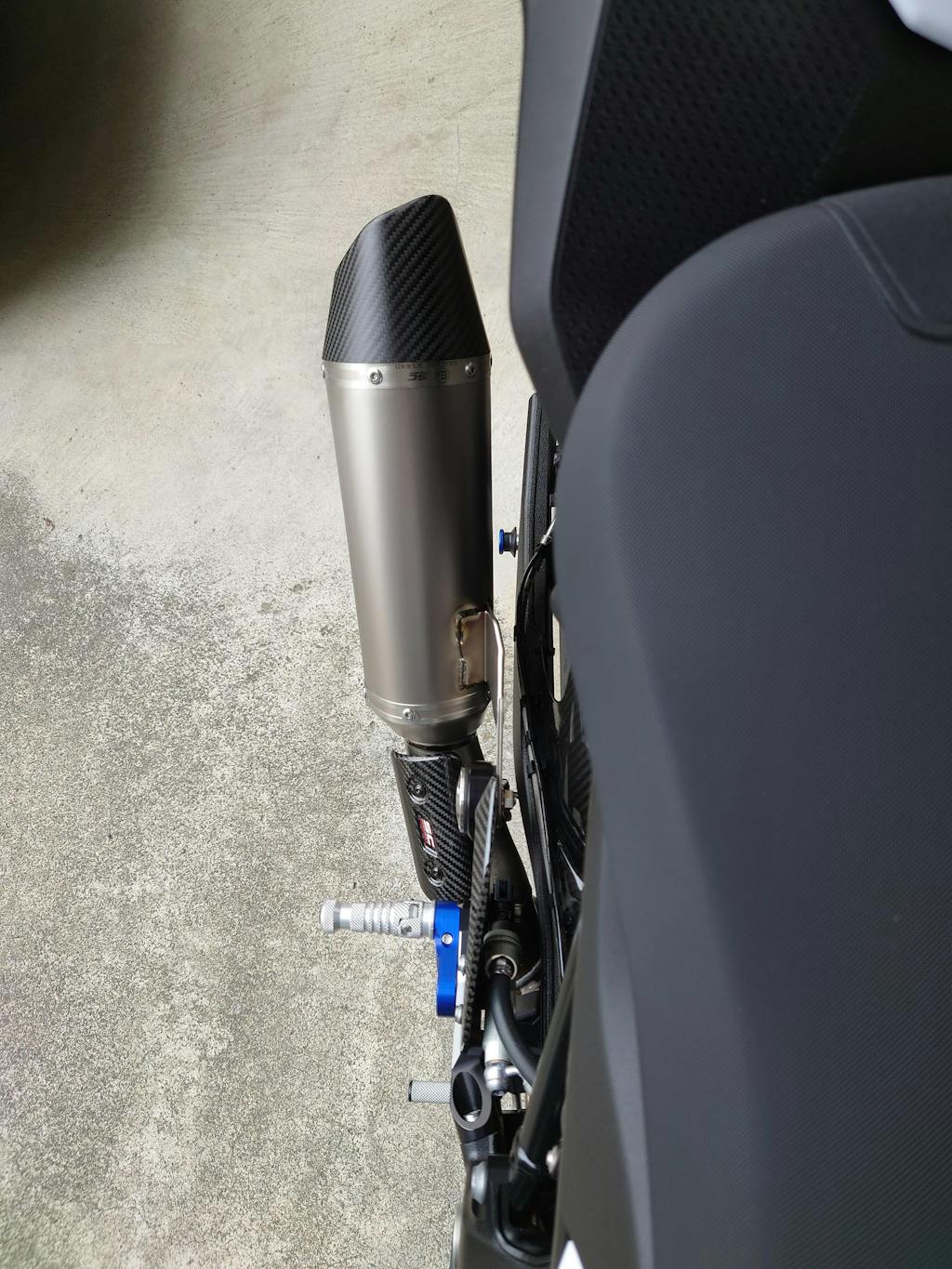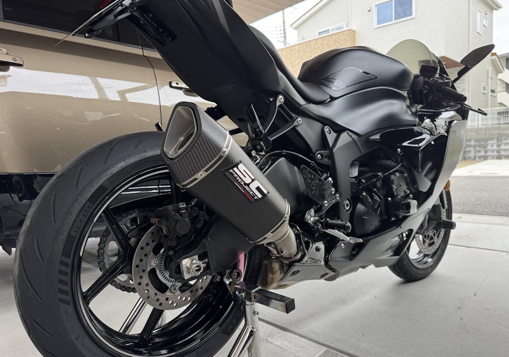 Sのノーマルマフラーは、後ろから見ると右上部斜め後方にかち上がっているのですが、SC1-Rは車体中心線とほぼ平行になる角度に設計されており、私好み!「よく考えられているなぁ」と感心しきりです。