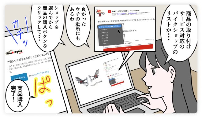 当サイトでご購入頂いた製品を弊社提携のバイクショップで装着できるサービスです。