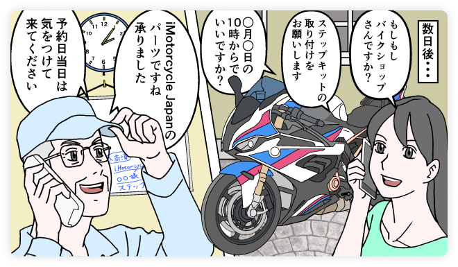 商品の用意が出来ましたらお知らせ致しますので、その後、お客様からバイクショップへ直接ご連絡して頂き、作業日程をご相談ください。