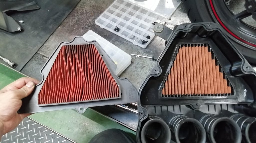 Sprint Filter (スプリントフィルター) 製のエアクリーナーは、MotoGPやWSBKなどの世界選手権で実績を持つ製品です。乾式フィルターのためオイルの塗布は不要で、純正エアフィルターと同じメンテナンスおよび交換サイクル時に、エアブローを使用しゴミを飛ばすことにより、繰り返し使用することができるため、ロングライフを実現しました。